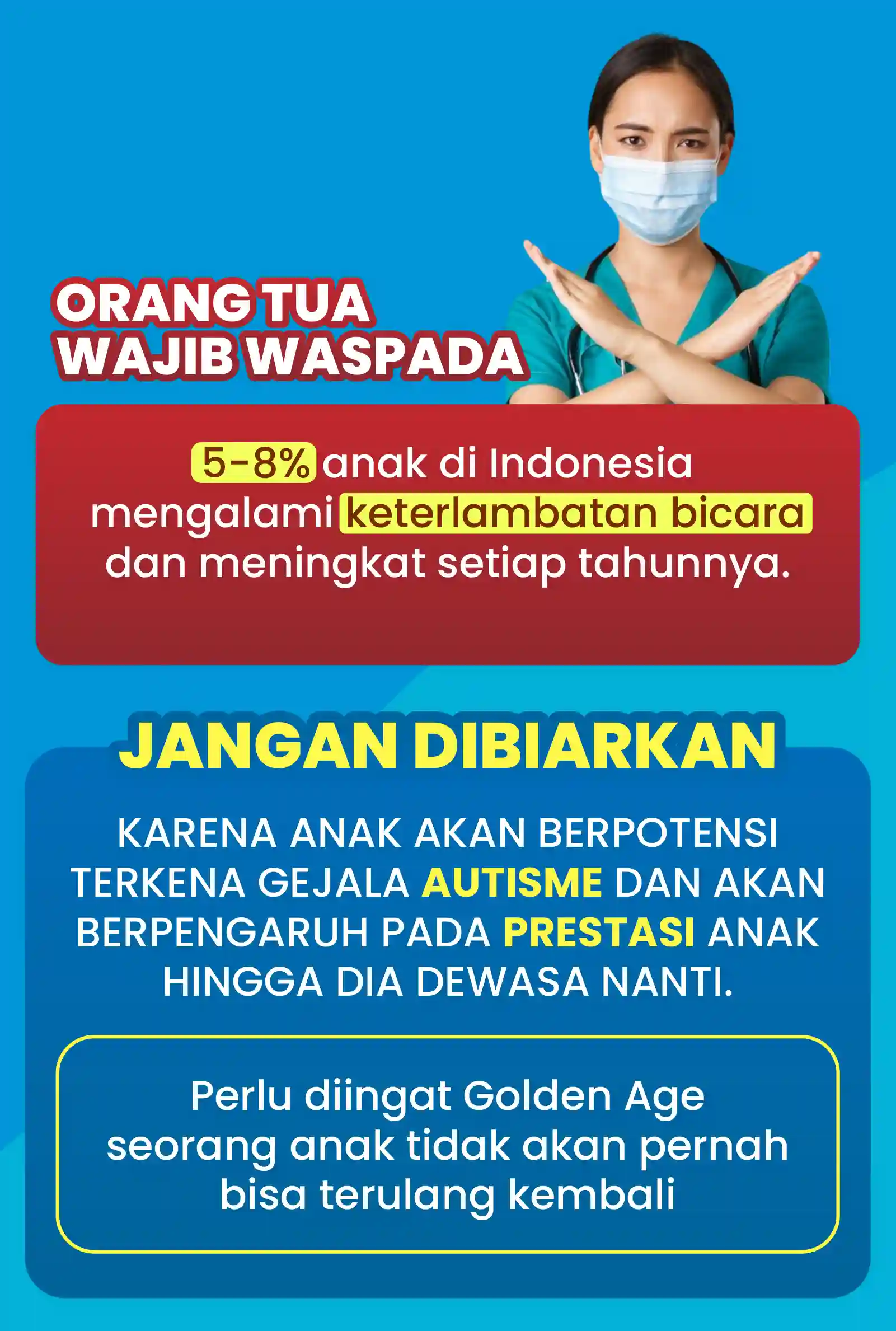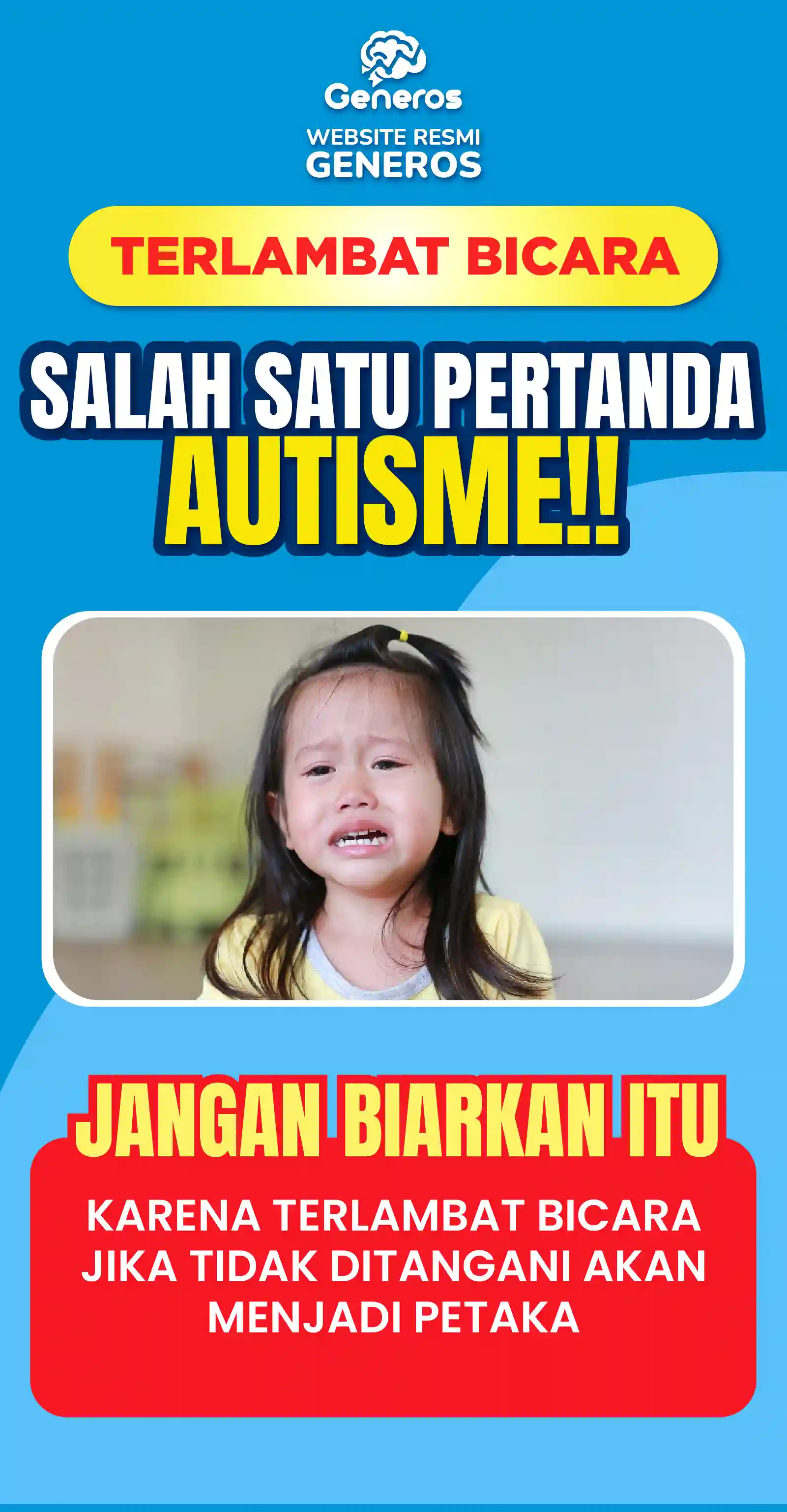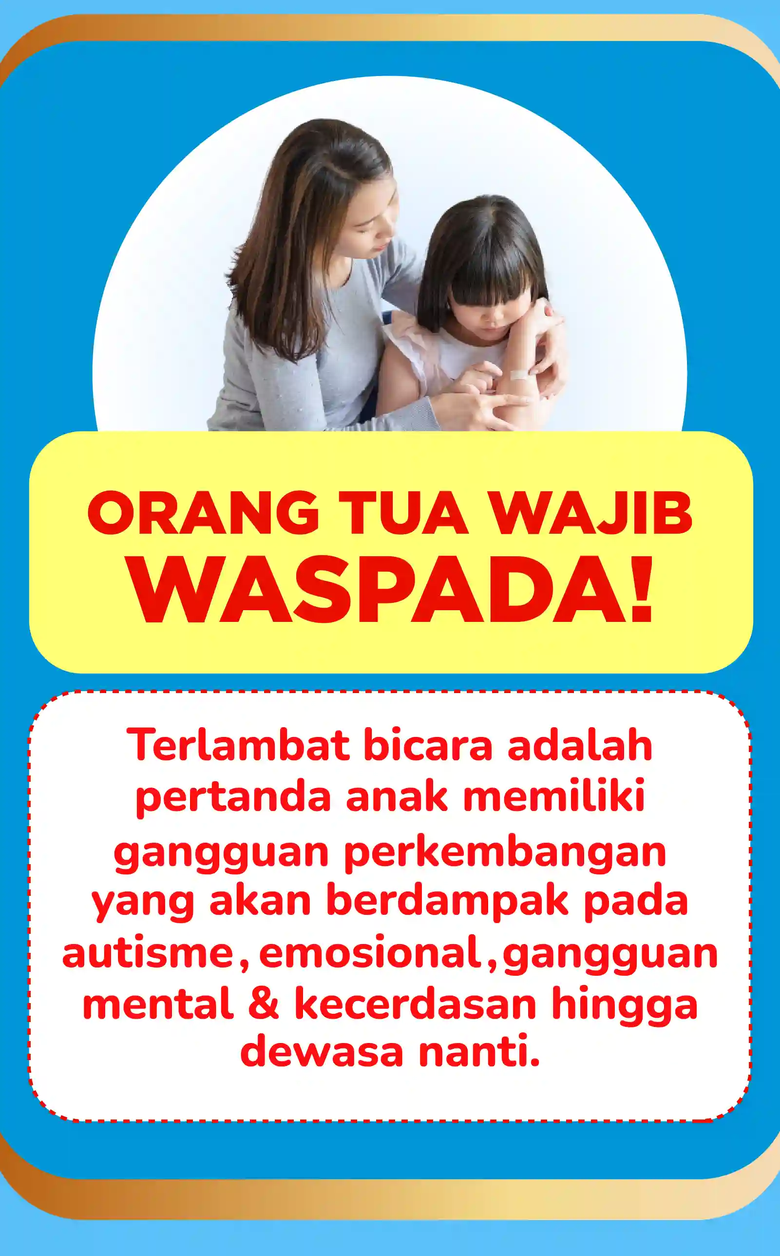 "Bayangkan kembali hanya karena Speech Delay masa depan anak mejadi terancam mulai sekarang jadilah orangtua yang peduli dengan tumbuh kembang anak, jika anda ragu sama saja harta lebih berarti daripada sibuah hati dan masa depannya."